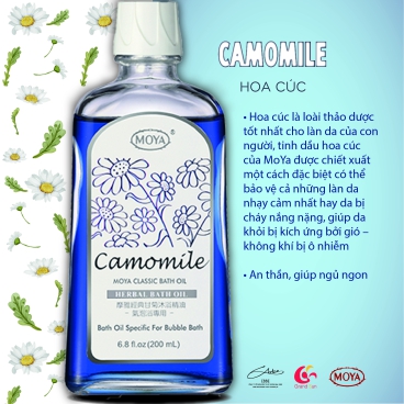 Hoa cúc là loài thảo dược tốt nhất cho làn da của con người, tinh dầu hoa cúc của MoYa được chiết xuất một cách đặc biệt có thể bảo vệ cả những làn da nhạy cảm nhất hay da bị cháy nắng nặng, giúp da khỏi bị kích ứng bởi gió – không khí bị ô nhiễm. An thần giúp ngủ ngon.
